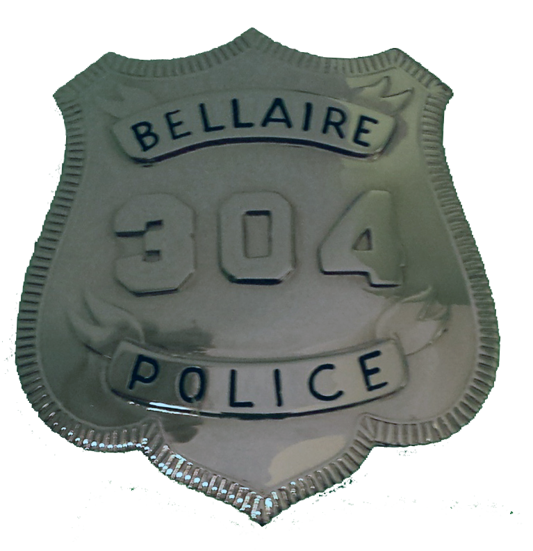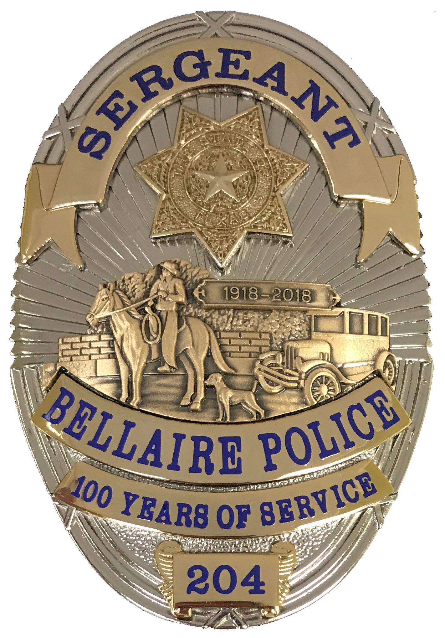 The City of Bellaire was established in 1908. In celebration of the Centennial of Bellaire, a special badge was designed. This badge was worn by officers from March 2008 until January 1st, 2009. In the center of the badge is a reproduction of a picture of the first Town Marshal of Bellaire. The badge lists the Officer's rank, name, and year of employment. It was issued and worn for the year 2008.